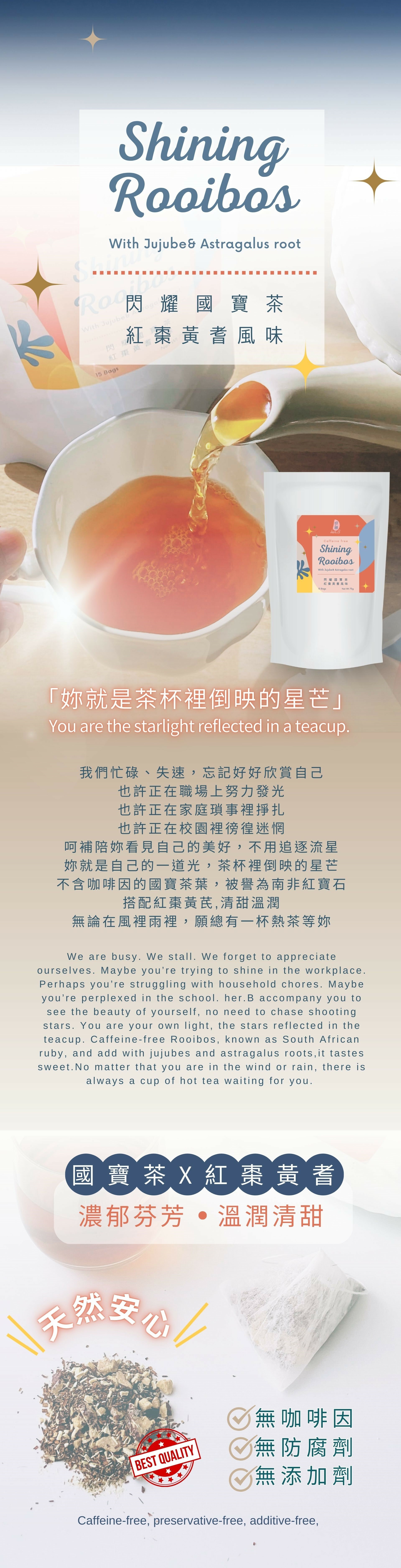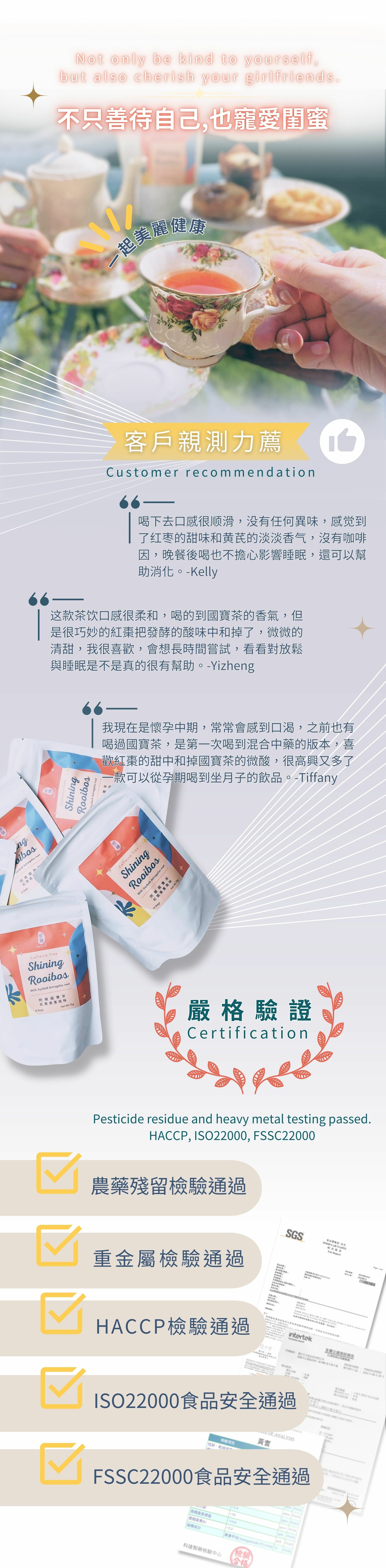 閃耀國寶茶使用通過SGS檢驗的南非國寶茶以及通過台灣檢驗把關的安心紅棗與黃耆,
